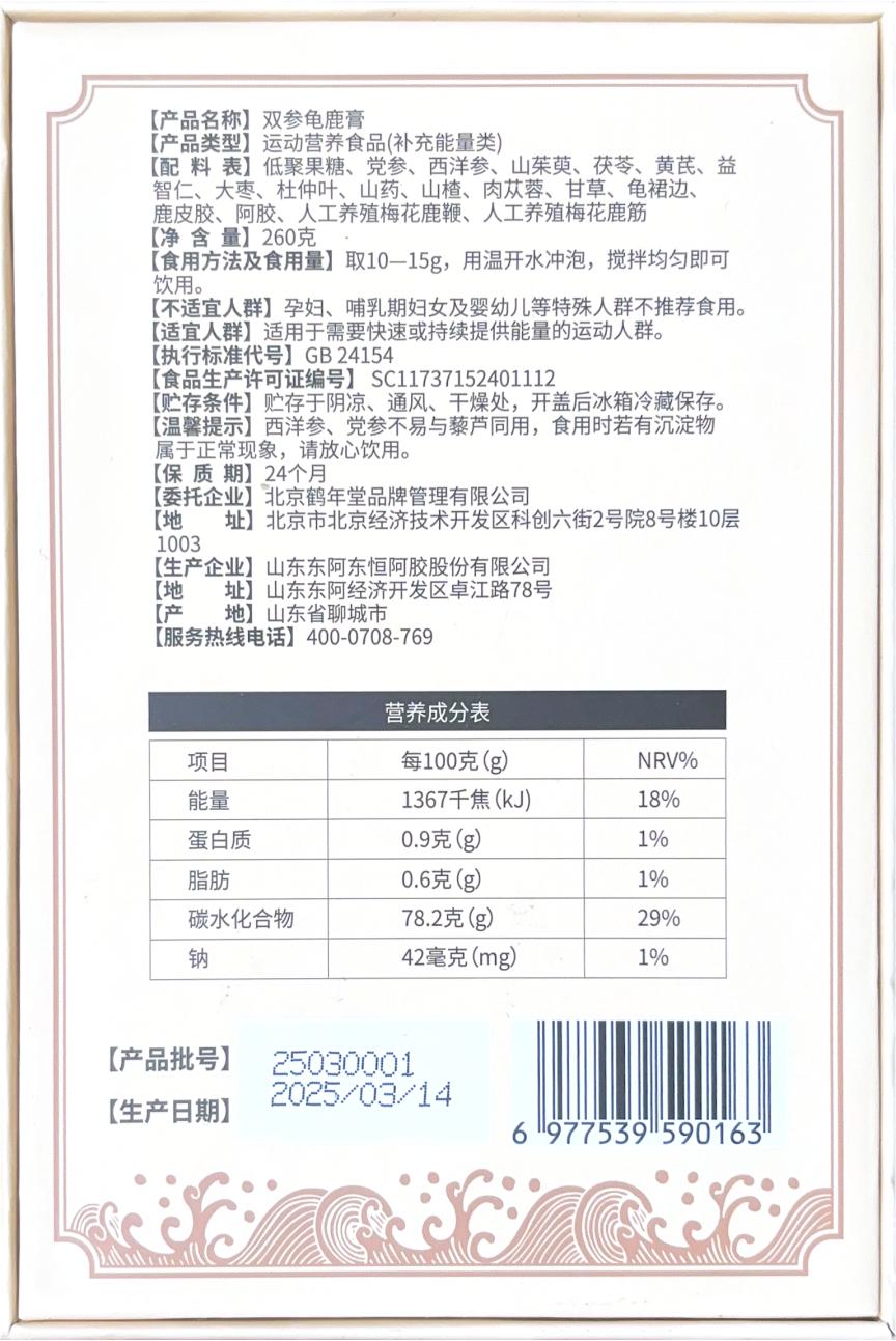 【配料表】低聚果糖、党参、西洋参、山茱萸、茯苓、黄芪、益智仁、大枣、杜仲叶、山药、山楂、肉苁蓉、甘草、龟裙边、鹿皮胶、阿胶、人工养殖梅花鹿鞭、人工养殖梅花鹿筋
